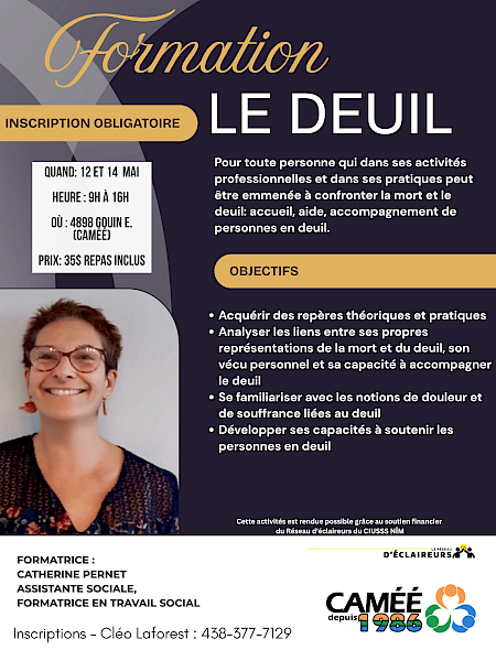 CAMÉÉ (Centre d'activités pour le maintien de l'équilibre émotionnel de Montréal-Nord) propose deux journées de formation par une spécialiste de l'accompagnement des personnes endeuillées.