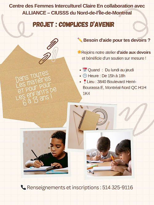 Nous offrirons un service d’aide aux devoirs pour les enfants de 6 à 13 ans, ainsi que des ateliers destinés aux parents, afin d’accompagner les familles qui peuvent nécessiter un soutien supplémentaire.